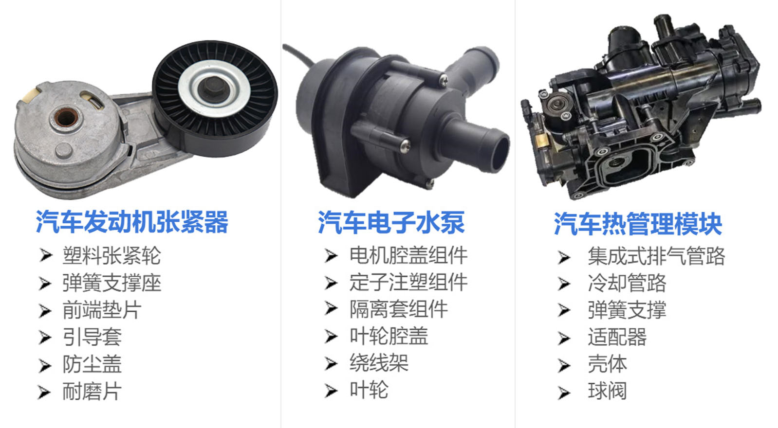 主要产品有汽车爆震传感器,汽车发动机塑料张紧轮部件,汽车电子水泵部件,汽车热管理模块部件,汽车碳罐电磁阀部件,汽车安全气囊部件,汽车管路部件,汽车涡轮增压消音器部件,机油泵,真空泵,电子压缩机等。